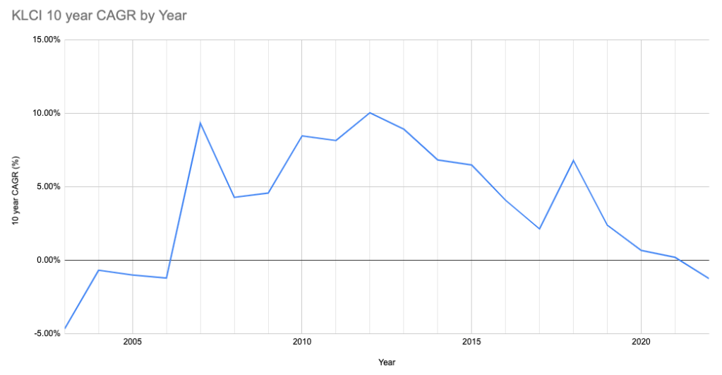 If you’ve put all your investments in the Malaysian stock market for the past 10 years, you would have soundly failed your goal. As of today November 26th 2022, the KLCI, excluding dividends, is now lower than what it was 10 years ago (1,486 vs 1,610).