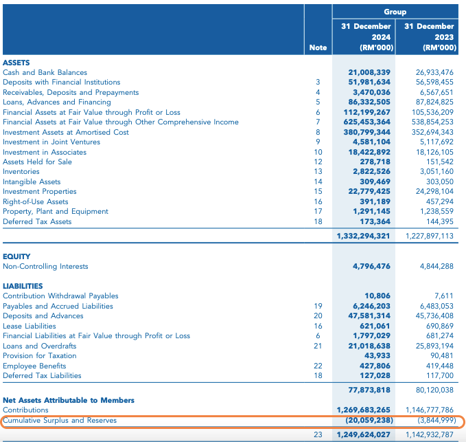The financial statements show that at the end of 2024, the total amount sitting in all the employees’ EPF accounts was RM 1.27 trillion. Still, the fund also had RM 20 billion of deficit in its cumulative “surplus” and reserves account. This meant if it sold every investment to pay back the account holders, it was still short by RM 20 billion. And this was a bigger deficit than the RM 4 billion back in 2023.